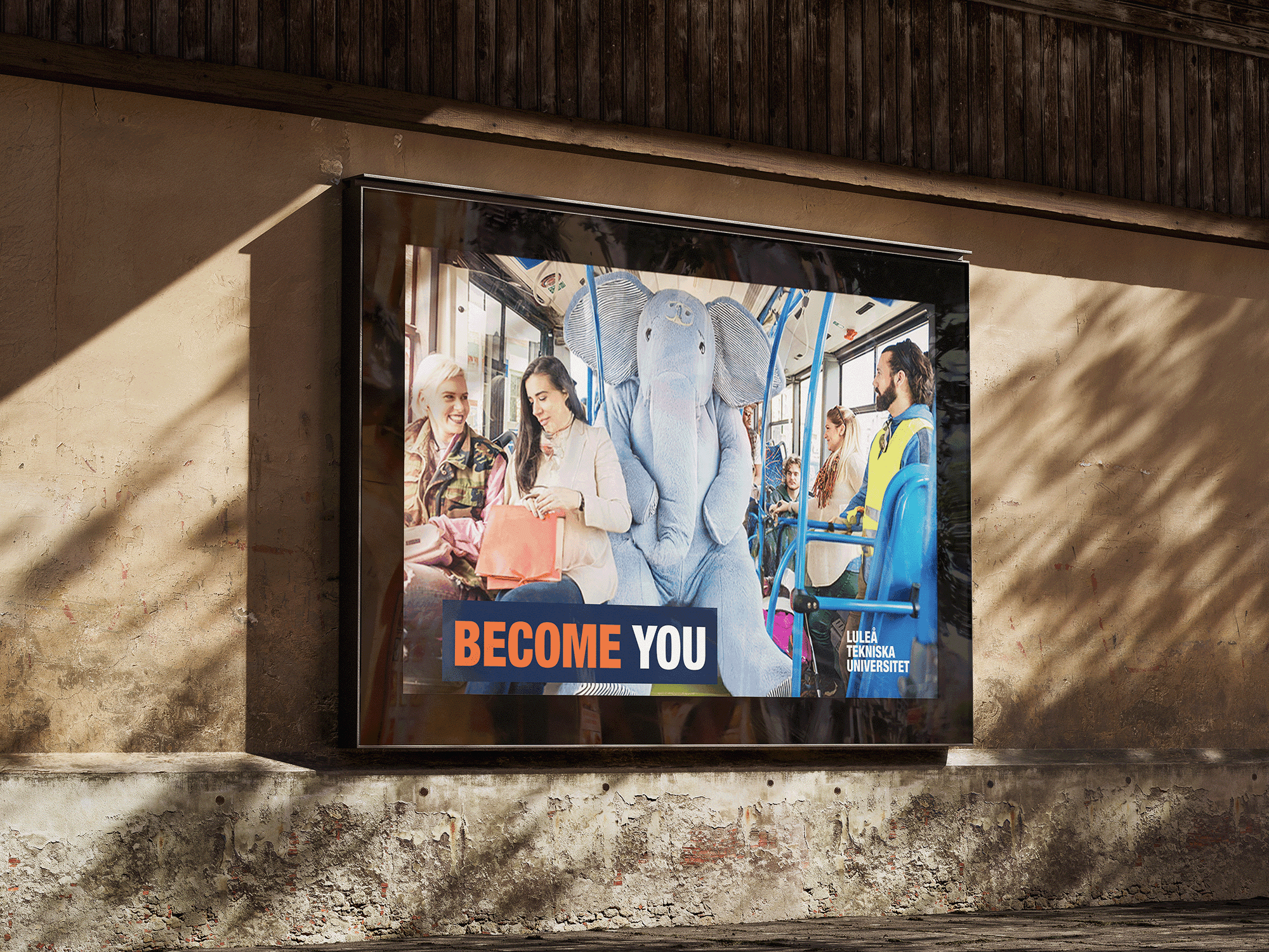 Jag ville förstärka budskapet genom att dra copy och bildidéer till sin spets och visuellt gestalta (ofta metaforiskt) att gå sin egen väg. Genom starka kontextuella kontraster och oväntade visuella möten - där utbildningsområden som rymdteknik och ingenjörskap anspelas symboliskt - skapades ett uttryck som ville uppmuntra individualitet och självständighet. Ambitionen var att kommunikationen skulle kännas självsäker, poppig och inkluderande samtidigt, och förmedla att universitetet är en plats där det finns utrymme att sticka ut och utvecklas på egna villkor. Tillåt dig att vara elefanten i rummet!