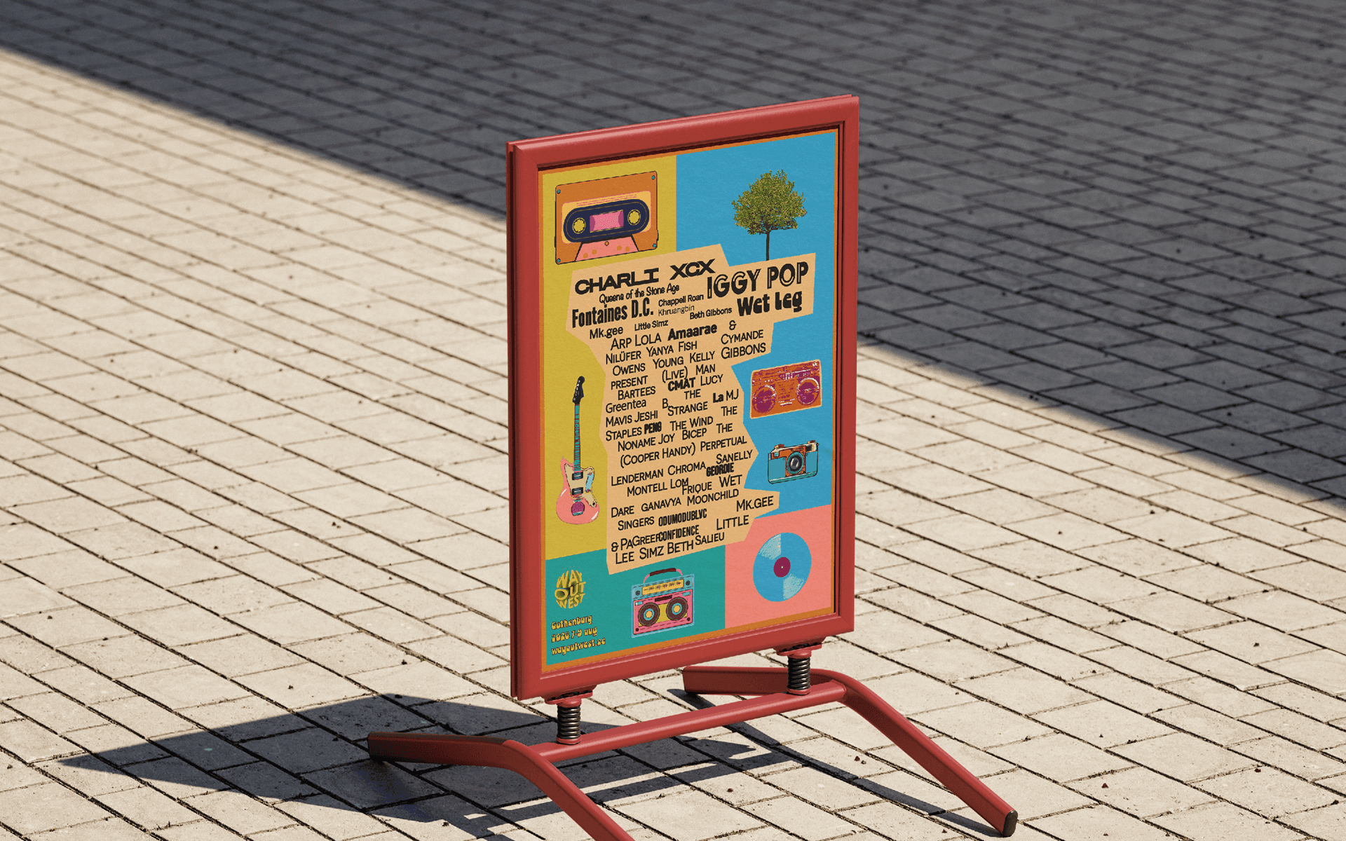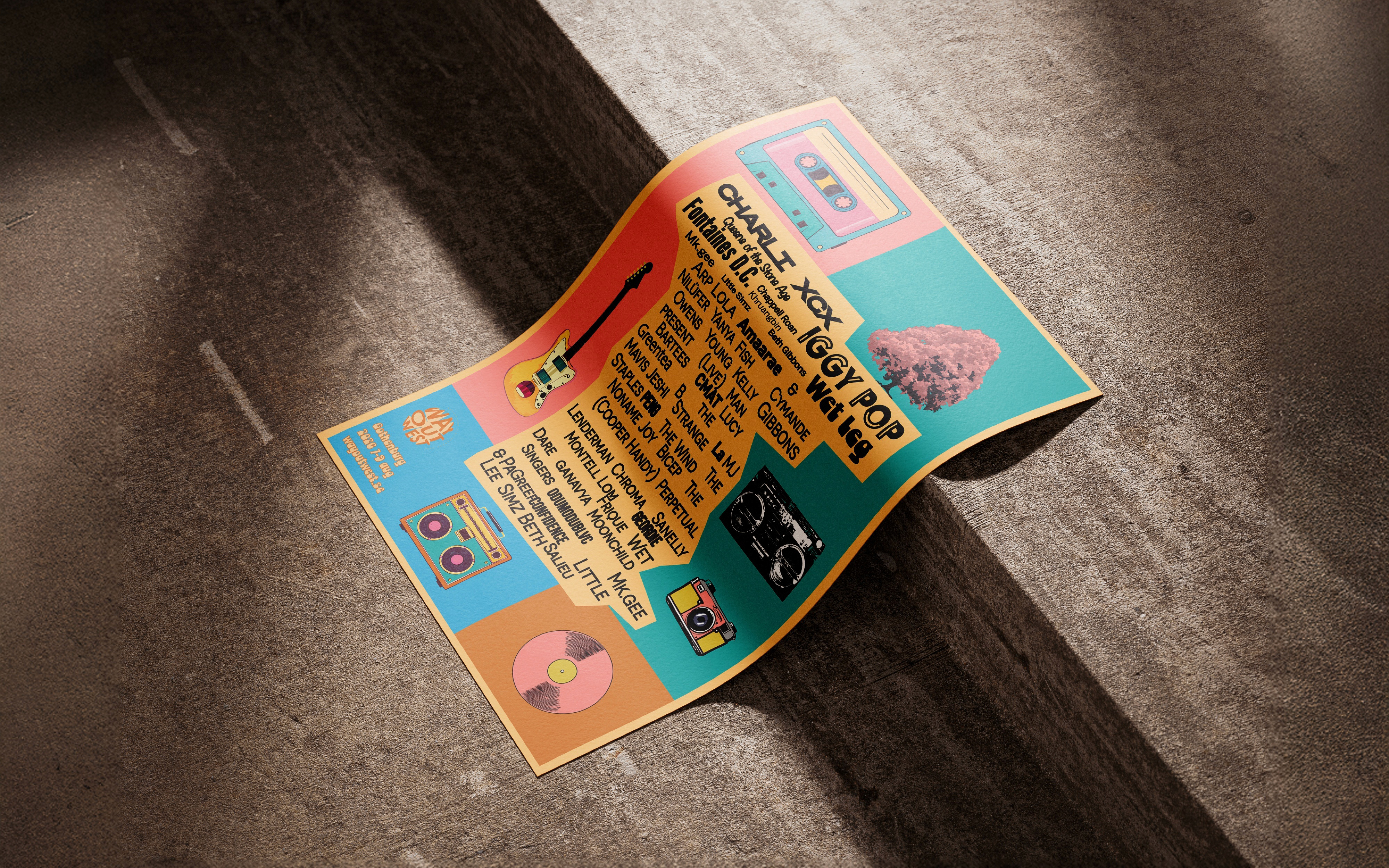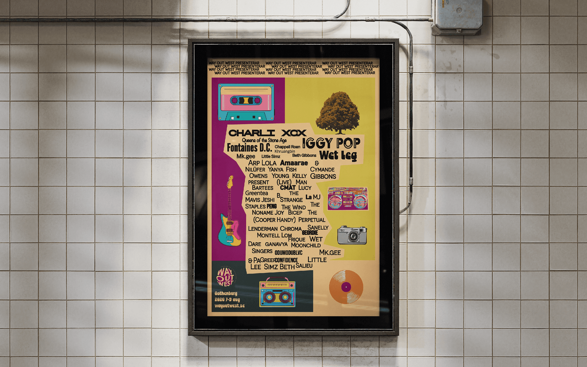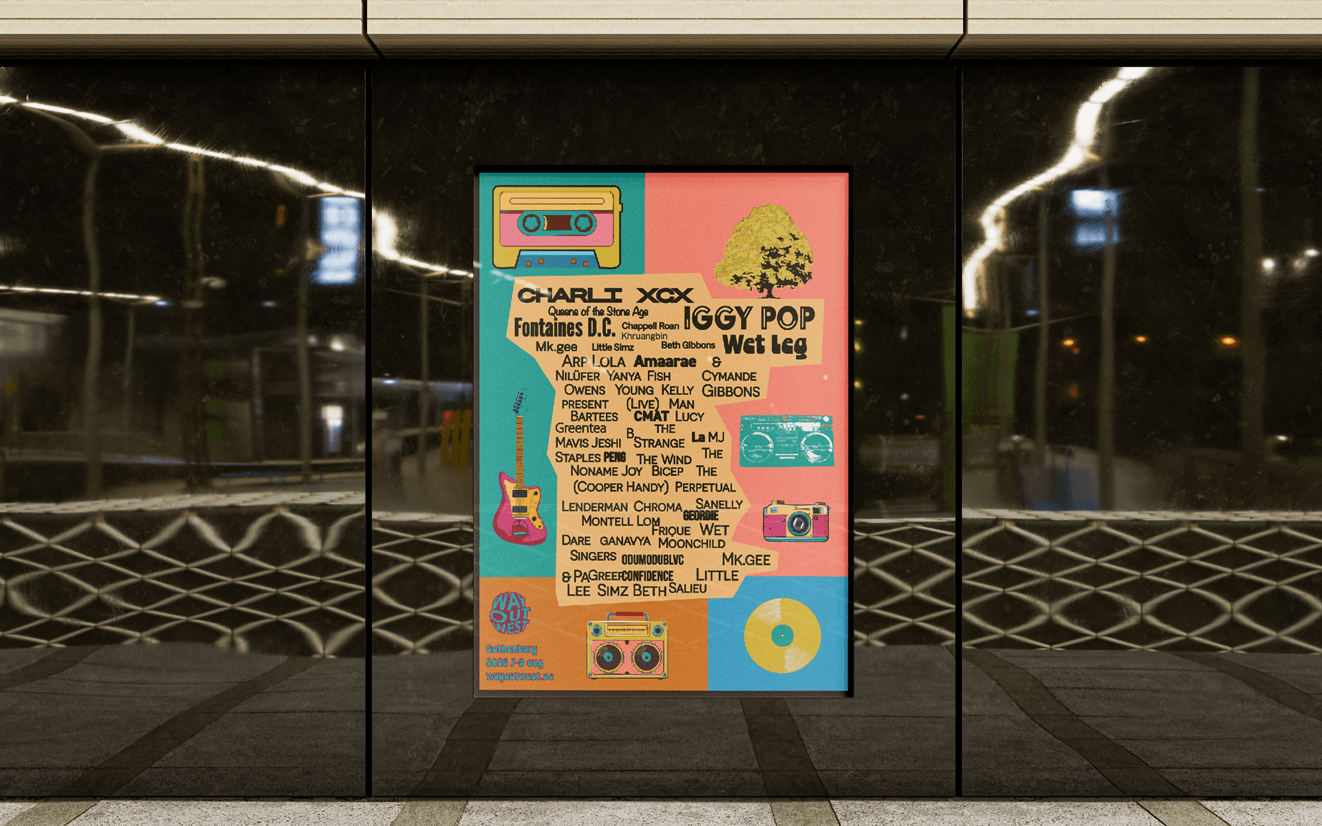 Jag arbetade med retroinfluenser för att skapa en tidlös grund - ett uttryck som känns bekant och nostalgiskt, men samtidigt färgstarkt och aktuellt. Inspiration hämtades från analog musik- och festivalkultur: vinylskivor, kassettband, gamla kameror och starka färgkombinationer som för tankarna till musikens historia och gemensamma upplevelser över tid.
