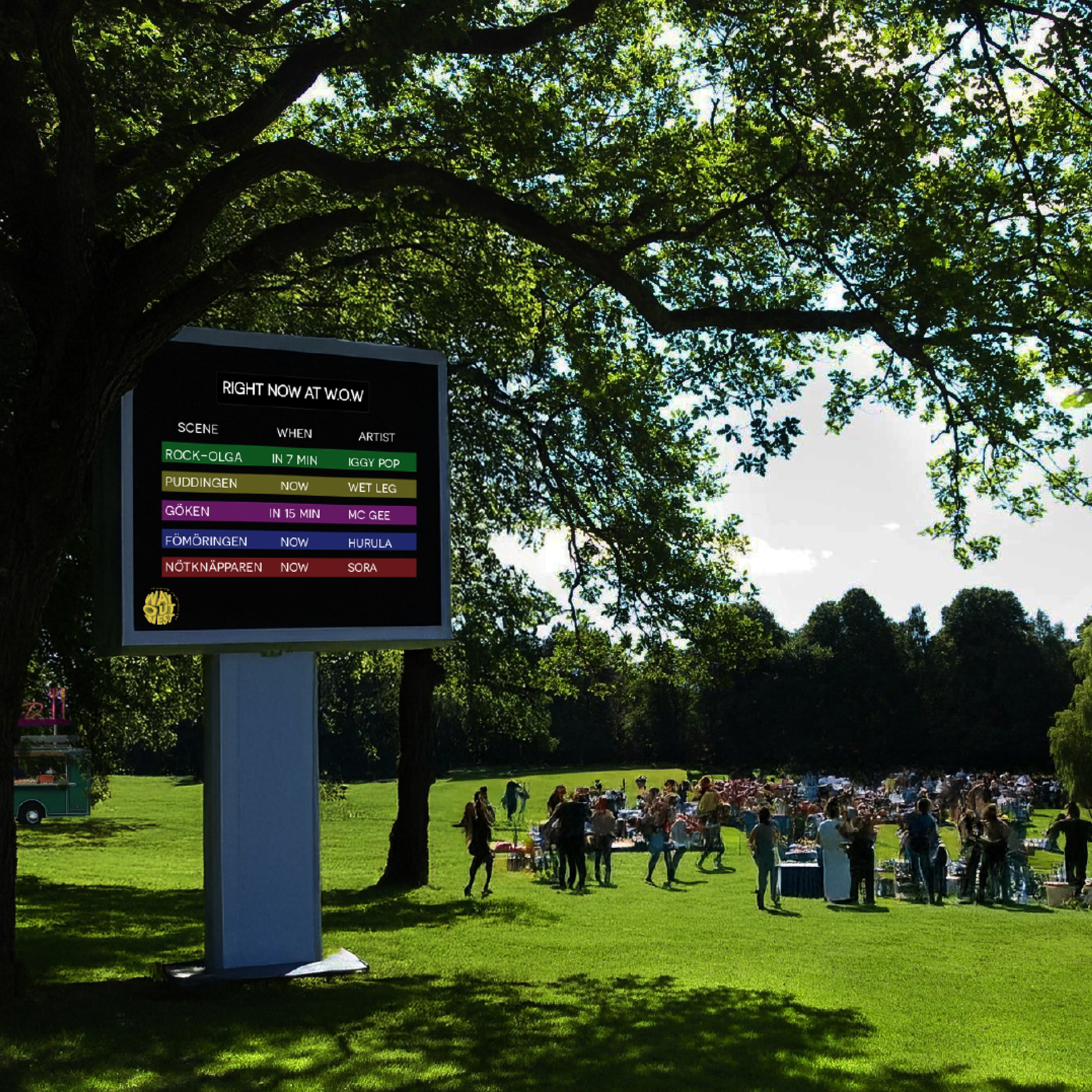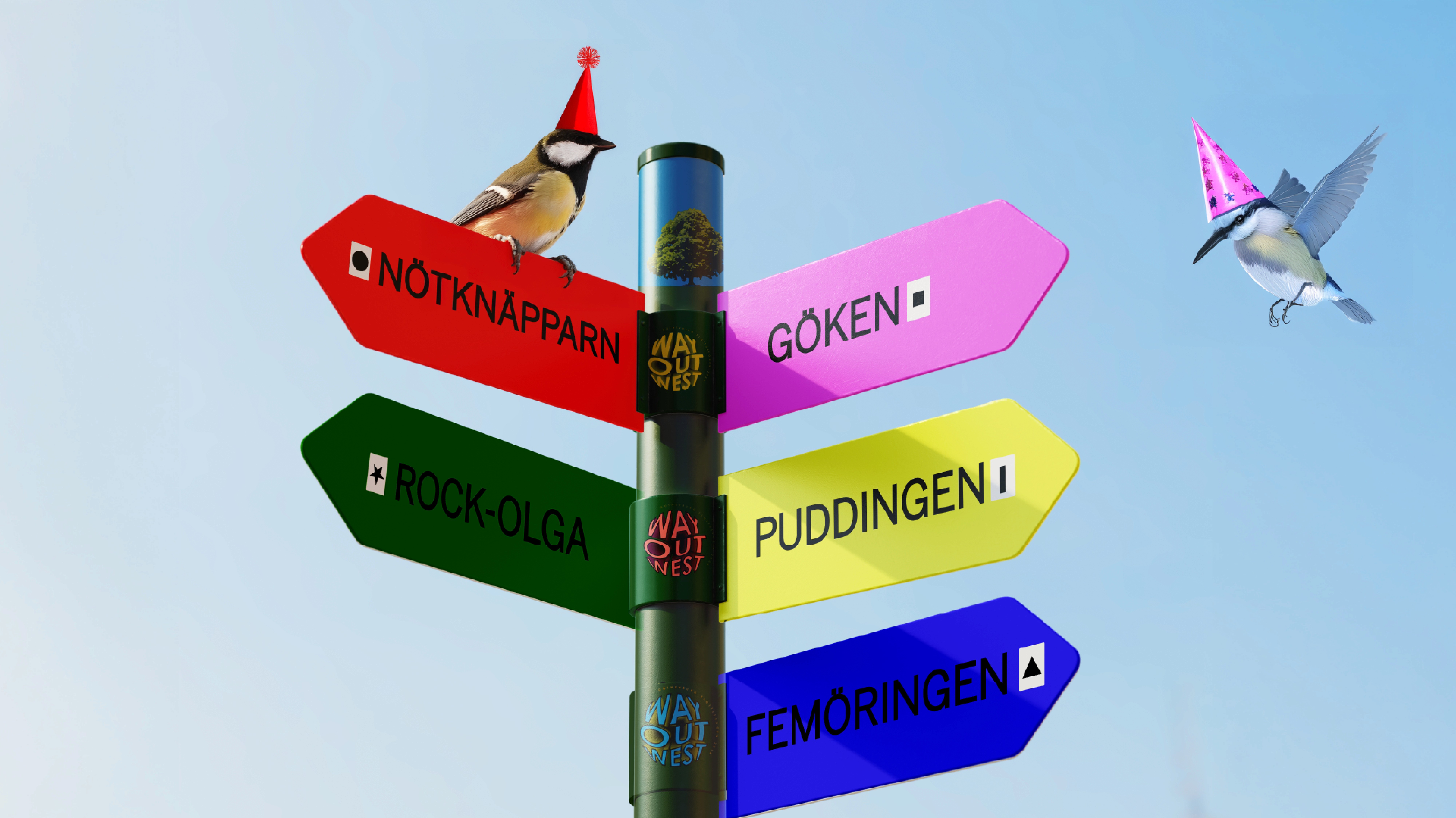 Eftersom festivalen utspelar sig mitt i Slottsskogen fick naturen spela en tydlig roll i kontrast till de grafiska elementen. Det organiska möter det poppiga - grönska mot färgblock, lugn parkmiljö mot energi och rörelse. Wayfinding-systemet bygger på tydliga former, starka kulörer och repetitiva element som snabbt går att känna igen i ett festivalflöde där människor rör sig, letar och upptäcker samtidigt. Något som hjälper dig hitta rätt scen och favoritartist, men också förstärker känslan av att faktiskt vara mitt i en festival.